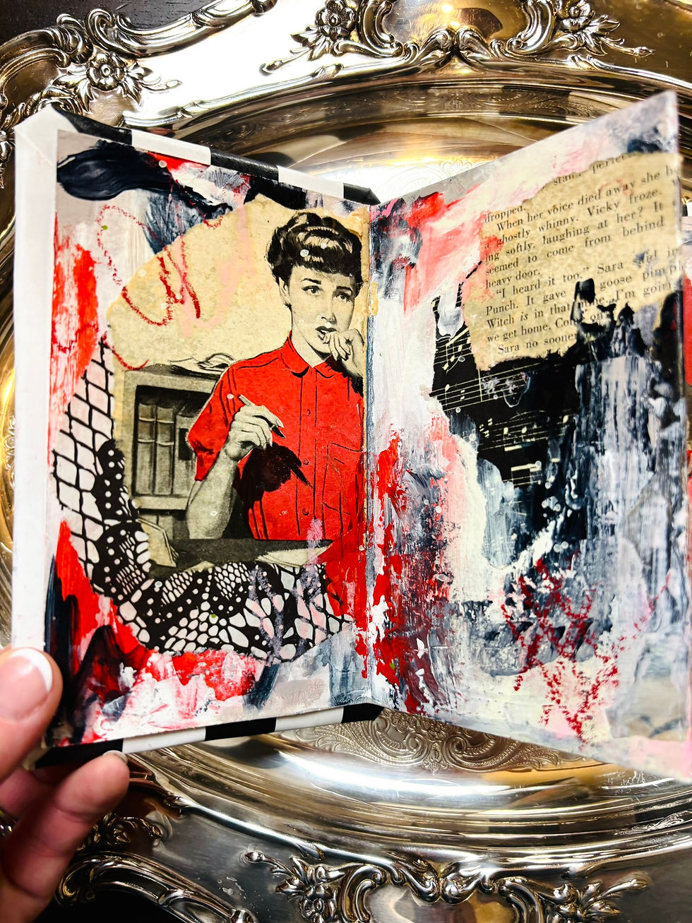 These handmade concertina booklets are miniature works of art designed to unfold into layered, story-driven scenes. Each one is created using mixed media and carefully curated vintage magazine clippings from the 1950s, giving every piece a sense of nostalgia, charm, and quiet intrigue.